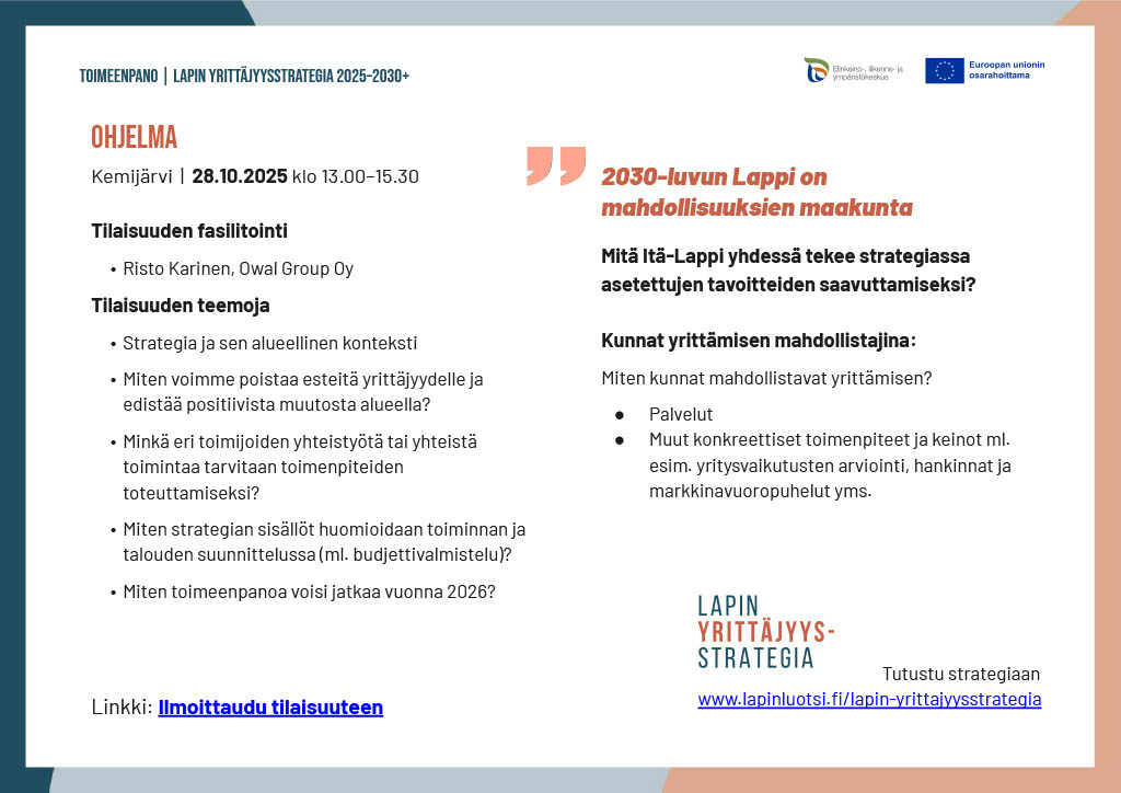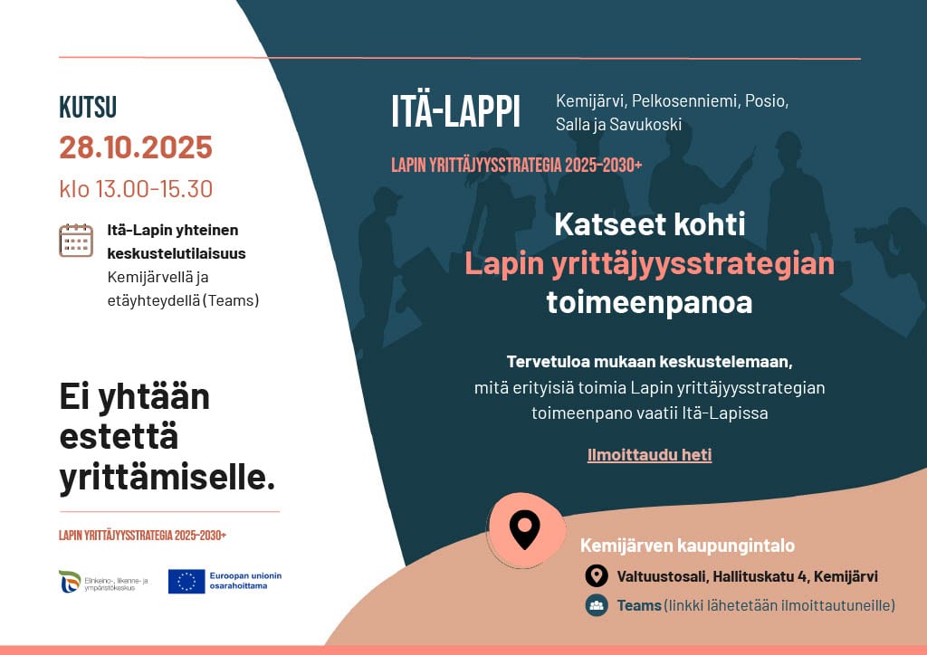 Etusivu / Ajankohtaista / Lapin yrittäjyysstrategian toimeenpanotilaisuus Lapin yrittäjyysstrategian toimeenpanotilaisuus 13.10.2025 Lapin yrittäjyysstrategian toimeenpanotilaisuus Kemijärvellä ja etäyhteydellä Ilmoittautuminen: https://urly.fi/3WNA Tervetuloa mukaan keskustelemaan!