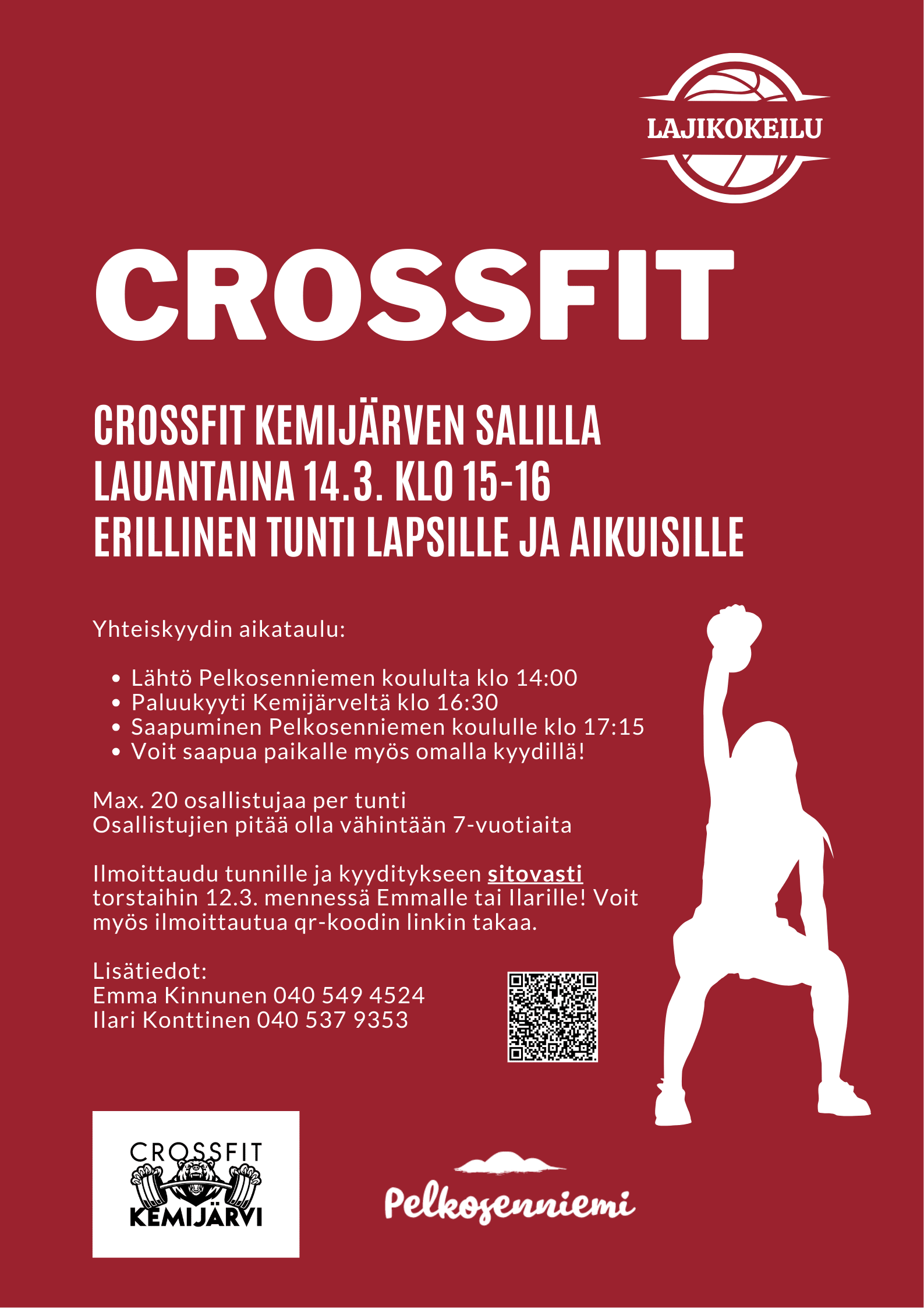 Lauantaina 14.3. klo 15-16 järjestämme lajikokeilun yhdessä Crossfit Kemijärven kanssa. Paikalle Kemijärven liikuntahallille voi saapua omilla kyydeillä tai kunnan tarjoamalla yhteiskyydityksellä. Samaan aikaan koulun salissa on Kaikki liikkuu – päivän ohjelmaa lapsille ja nuorille. Aikuisten ohjaaja on tällä kertaa mukana Kemijärven reissulla. 🤸♀️