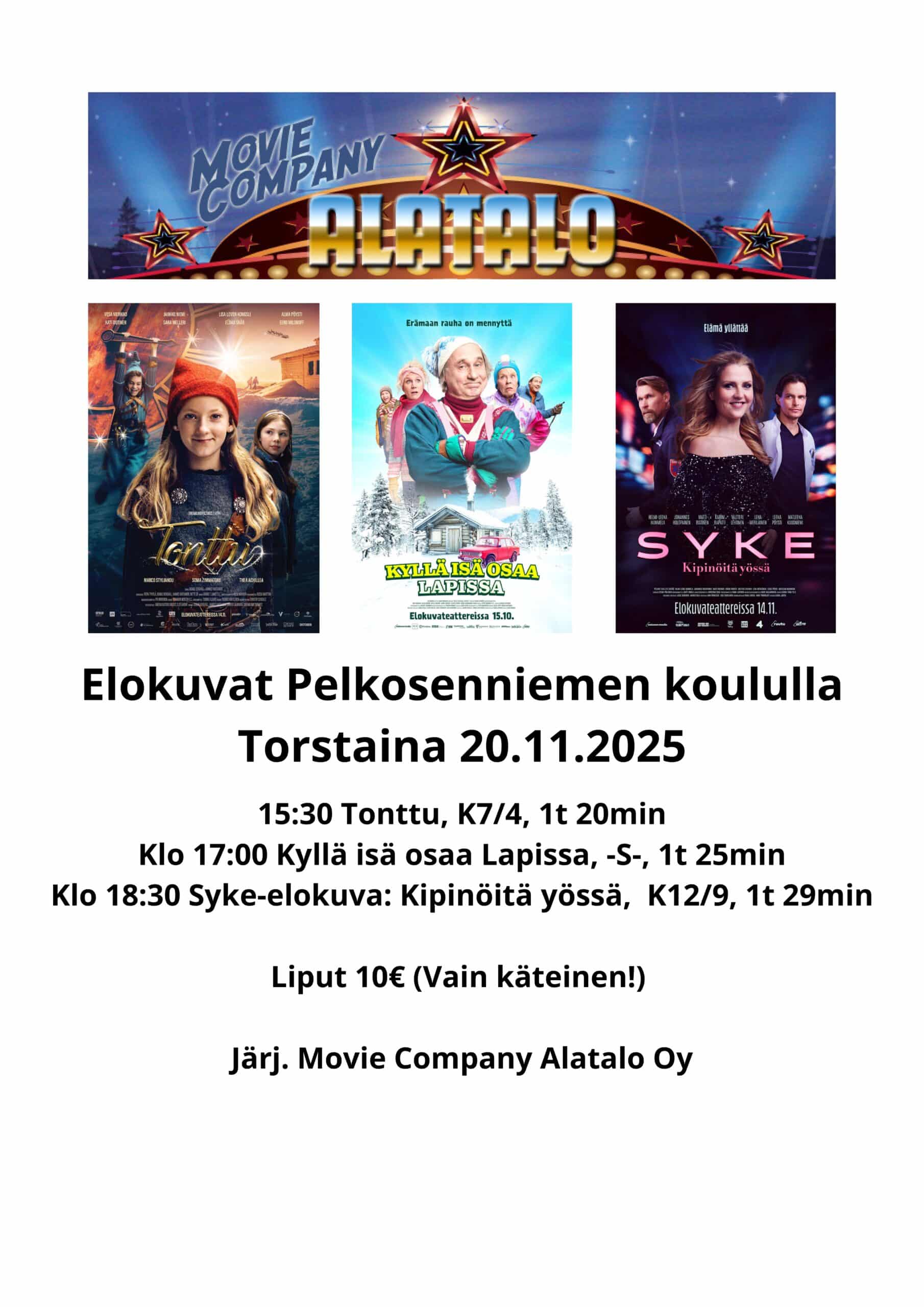 Etusivu / Tapahtumat / Elokuvailta Pelkosenniemellä Elokuvailta Pelkosenniemellä Koulun liikuntasali Tapahtuma alkaa: 20/11/2025 14:30 Tapahtuma loppuu: 20/11/2025 20:00