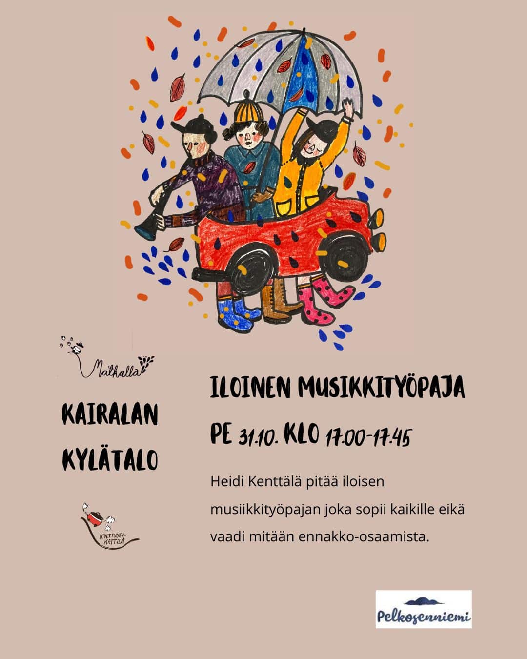 Etusivu / Tapahtumat / Iloinen musiikkityöpaja Iloinen musiikkityöpaja Kairalan Kajastus Tapahtuma alkaa: 31/10/2025 17:00 Tapahtuma loppuu: 31/10/2025 17:45 Tapahtumapaikka: Kairalan Kajastus Lähiosoite: Sodankyläntie 1125 Kaupunki: Kairala Postinumero: 98560