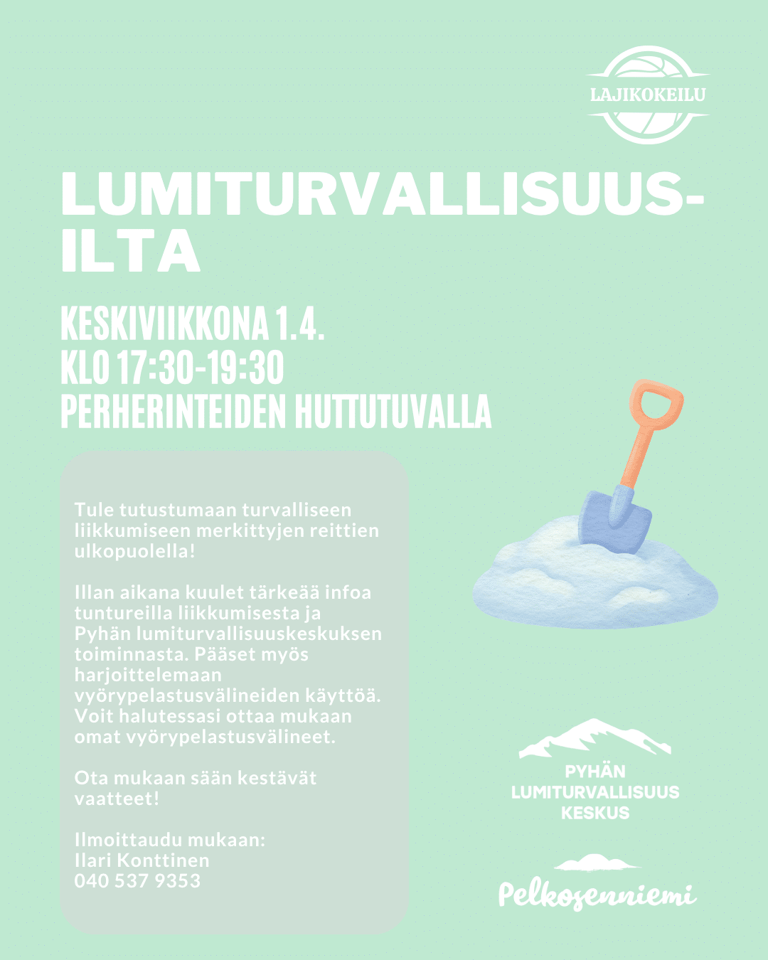 Tule siis Pelkosenniemen kunnan ja Pyhän Lumiturvallisuuskeskuksen järjestämään Lumiturvallisuus-iltaan perherinteiden Huttutuvalle keskiviikkona 1.4. klo 17:30-19:30! ✨ Illan aikana kuulet tärkeää tietoa tuntureilla liikkumisesta ja tutustut Pyhän Lumiturvallisuuskeskuksen toimintaan. Pääset myös harjoittelemaan vyörypelastusvälineiden käyttöä käytännössä ja tutustut muihin aiheesta kiinnostuneisiin liikkujiin! 🤩 Tämä työpaja sopii kaikille nuoresta aikuiseen ja aloittelijasta kokeneeseen tuntureilla liikkujaan.