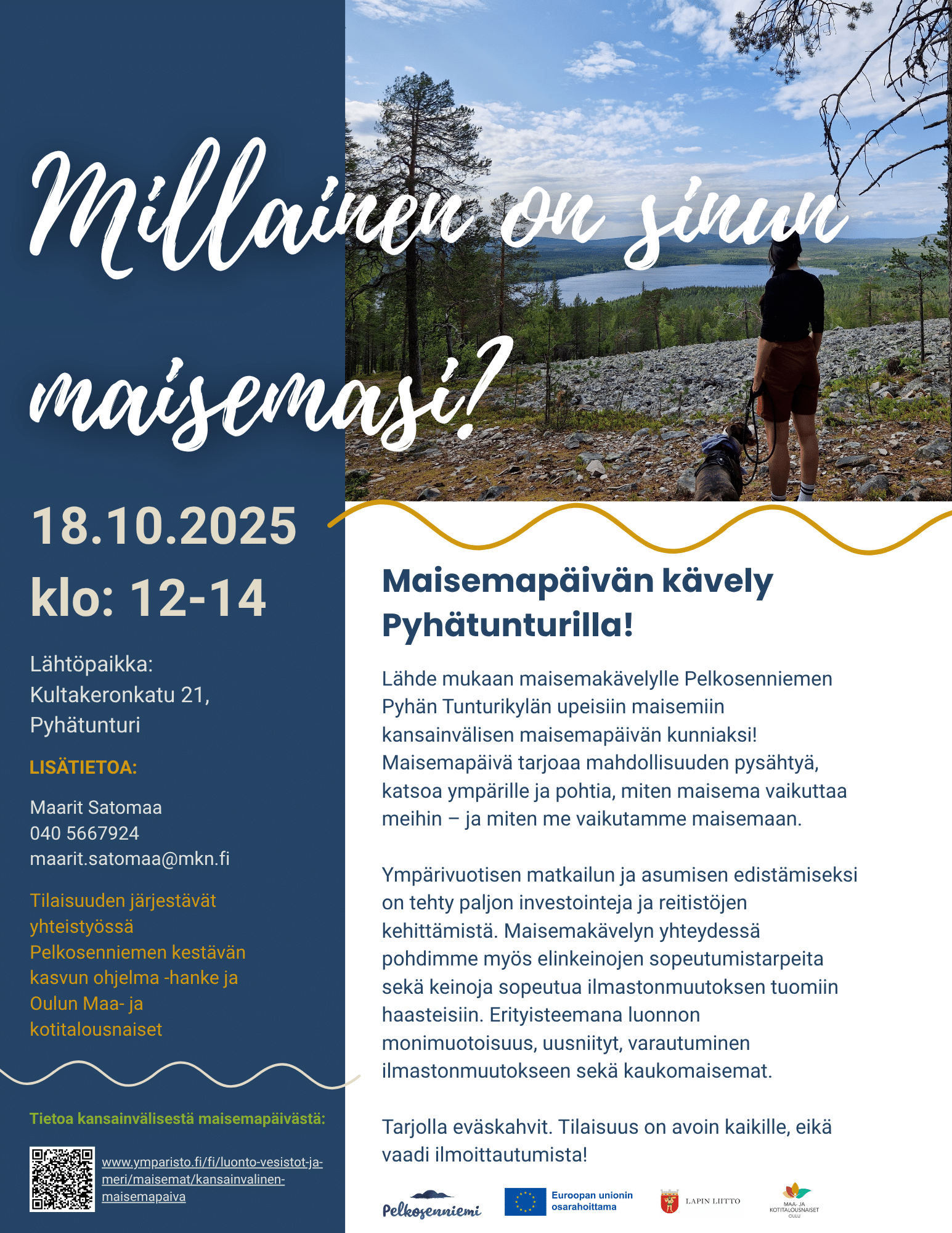 Lähde mukaan maisemakävelylle Pelkosenniemen Pyhän Tunturikylän upeisiin maisemiin kansainvälisen maisemapäivän kunniaksi! Maisemapäivä tarjoaa mahdollisuuden pysähtyä, katsoa ympärille ja pohtia, miten maisema vaikuttaa meihin – ja miten me vaikutamme maisemaan.