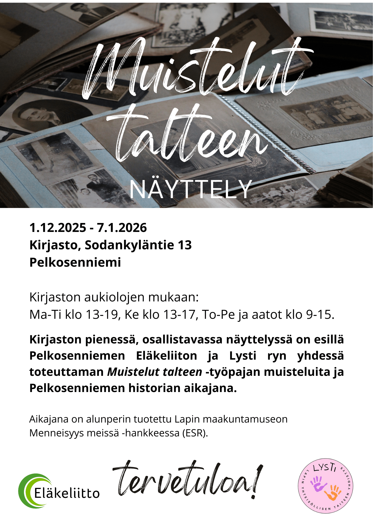 Tapahtuma alkaa: 01/12/2025 00:00Tapahtuma loppuu: 07/01/2026 00:00Tapahtumapaikka: Pelkosenniemen kirjastoLähiosoite: Sodankyläntie 13Kaupunki: PelkosenniemiPostinumero: 98500Lipun hinta: ilmainenTapahtuman järjestäjä ja yhteystiedot: Eläkeliitto Pelkosenniemen yhdistys ja LYSTI ry