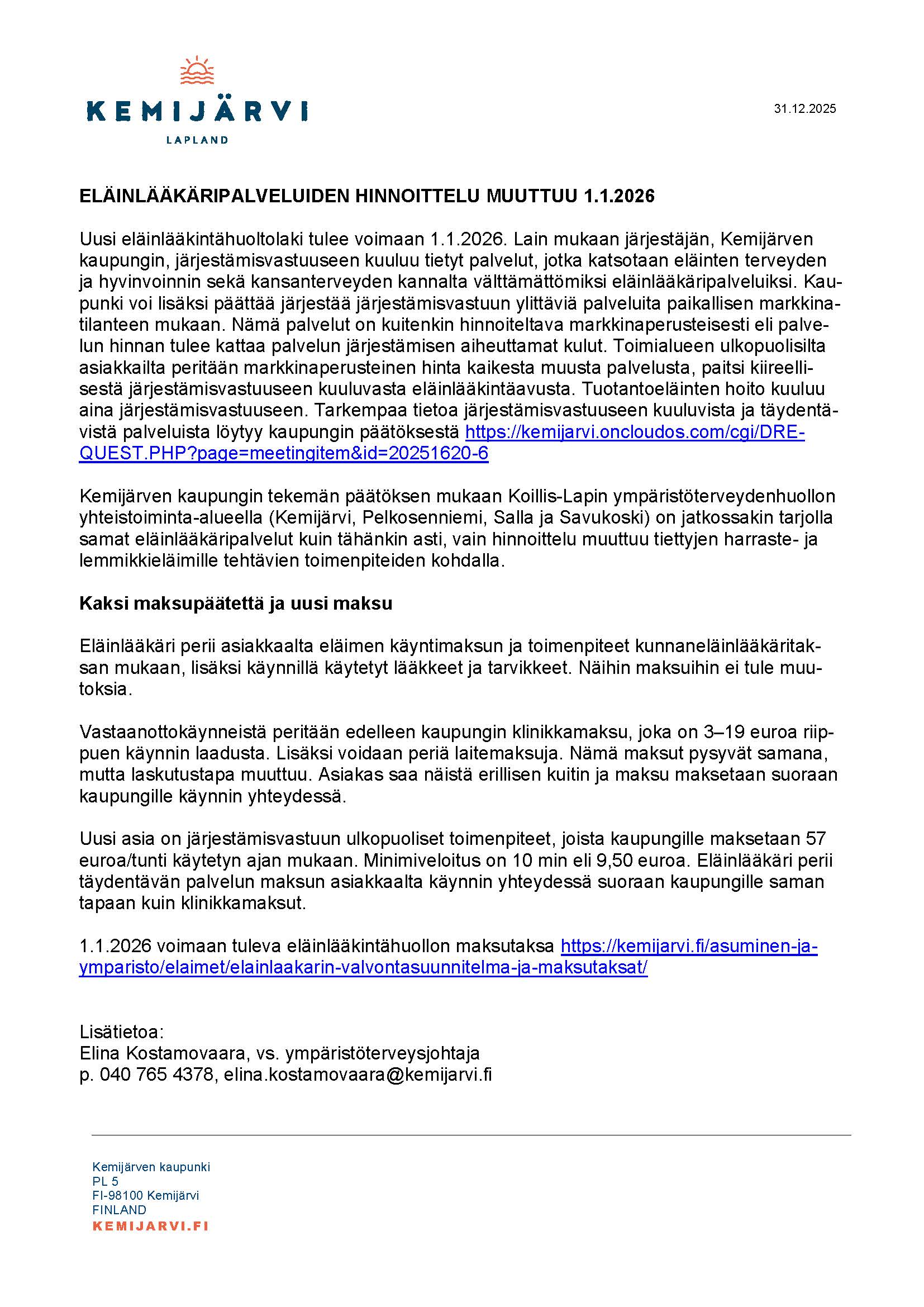 Etusivu / Ajankohtaista / Tiedote eläinlääkäripalveluiden hinnoittelun muutoksista Tiedote eläinlääkäripalveluiden hinnoittelun muutoksista 31.12.2025